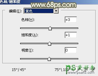 5、创建色相/饱和度调整图层,对黄色进行调整,参数及效果如下图。这一步微调图片中的暖色。