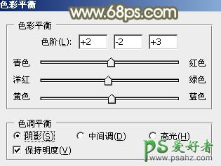 6、按Ctrl + Alt + 2 调出高光选区,按Ctrl + Shift + I 反选,然后创建色彩平衡调整图层,对阴影进行调整,参数及效果如下图。这一步给图片暗部增加红色。
