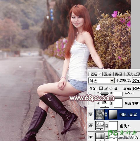 4、新建一个图层,选择字母键“D”,把前,背景颜色恢复到默认的黑白,然后选择菜单:滤镜 > 渲染 > 云彩,确定后把混合模式改为“滤色”,不透明度改为:50%。添加图层蒙版,用黑白渐变,由左上角至右下角拉出白色至黑色线性渐变,效果如下图。这一步给图片左上角增加云雾效果。