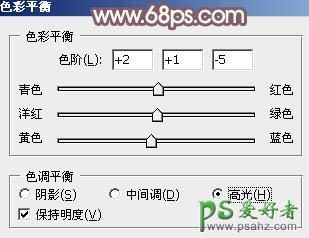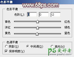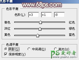 8、创建色彩平衡调整图层,对阴影、中间调,高光进行调整,参数设置如图20 - 22,效果如图23。这一步给图片增加橙黄色。