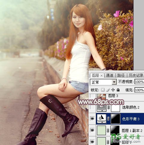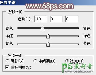 13、按住Ctrl键 + 鼠标左键点击图层蒙版载入蒙版选区,然后创建色彩平衡调整图层,对高光进行调整,参数及效果如下图。