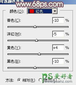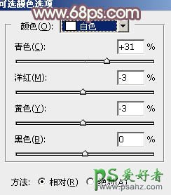 14、创建可选颜色调整图层,对红、黄,白进行调整,参数设置如图34 - 36,效果如图37。这一步给图片增加橙红色。