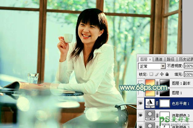 photoshop给办公室里的制服美女秘书生活照调出甜美的青黄色