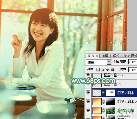 9、新建一个图层,用套索工具在右侧位置拉出图28所示的选区,羽化30个像素后填充橙红色:#EB6D45,混合模式改为“颜色”,如图28。然后按Ctrl + J 把当前图层复制一层,混合模式改为“叠加”,效果如图29。