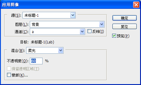 4、转到lab模式,选择合并图层,执行图像应用命令,设置如图: