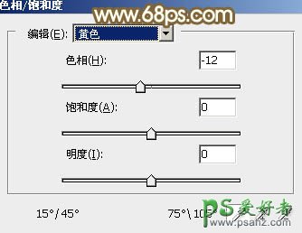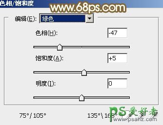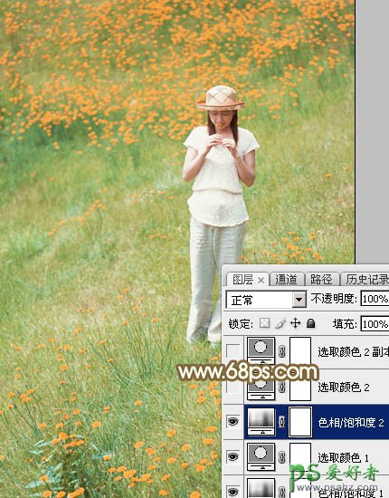 3、创建色相/饱和度调整图层,对黄色,绿色进行调整,参数及效果如下图。这一步把花朵的颜色转为橙红色,绿草颜色转为黄绿色。