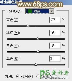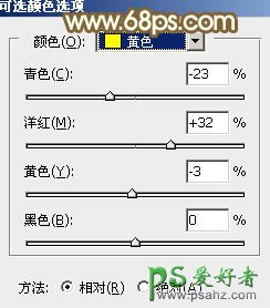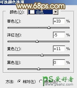 4、创建可选颜色调整图层,对黄、绿,白进行调整,参数设置如图8 - 10,效果如图11。这一步给图片增加橙黄色。