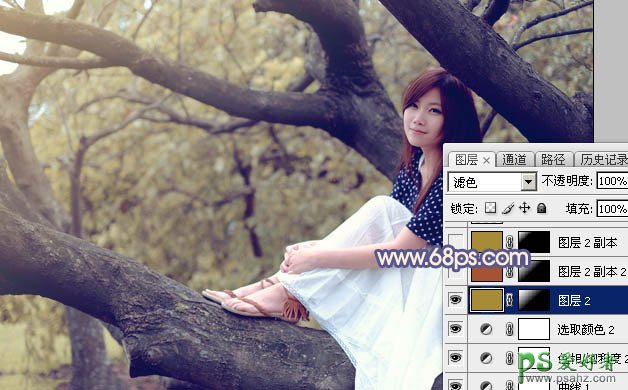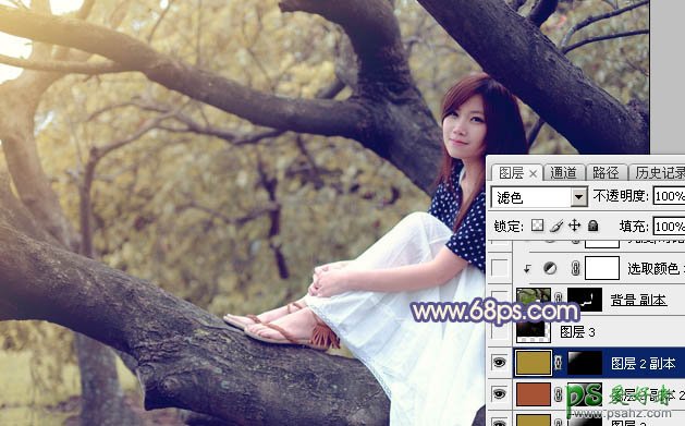 7、新建一个图层,填充黄褐色:#A68C35,混合模式改为“滤色”,按住Alt键添加图层蒙版,用白色画笔把左上角部分擦出来,效果如下图。