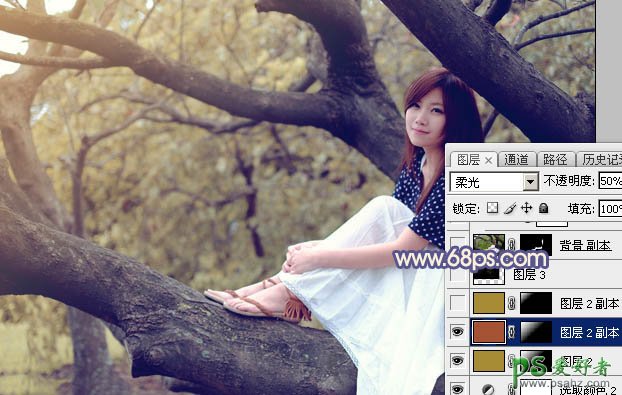 8、调出当前图层蒙版选区,然后创建纯色调整图层,颜色设置为暗红色:#A65335,确定后把混合模式改为“柔光”,不透明度改为:50%,效果如下图。