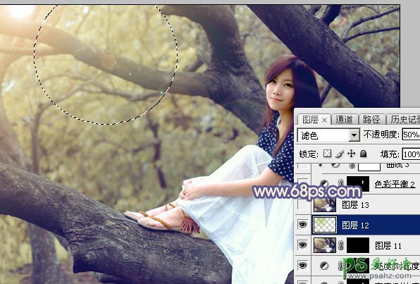 13、新建一个图层,用椭圆选框工具拉出下图所示的椭圆选区,羽化80个像素后填充黄绿色:#ABBF2A,确定后把混合模式改为“滤色”,不透明度改为:50%,效果如下图。这一步给图片中间位置增加高光。