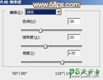 1、打开素材图片,创建色相/饱和度调整图层,对绿色进行调整,参数及效果如下图。这一步快速把背景中的绿色转为黄褐色。