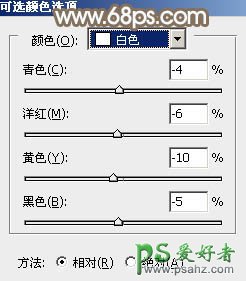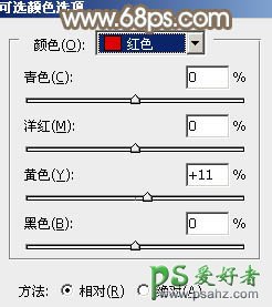 3、创建可选颜色调整图层,对红、黄、白进行调整,参数设置如图7 - 9,效果如图10。这一步微调图片颜色,并加强高光部分的颜色。