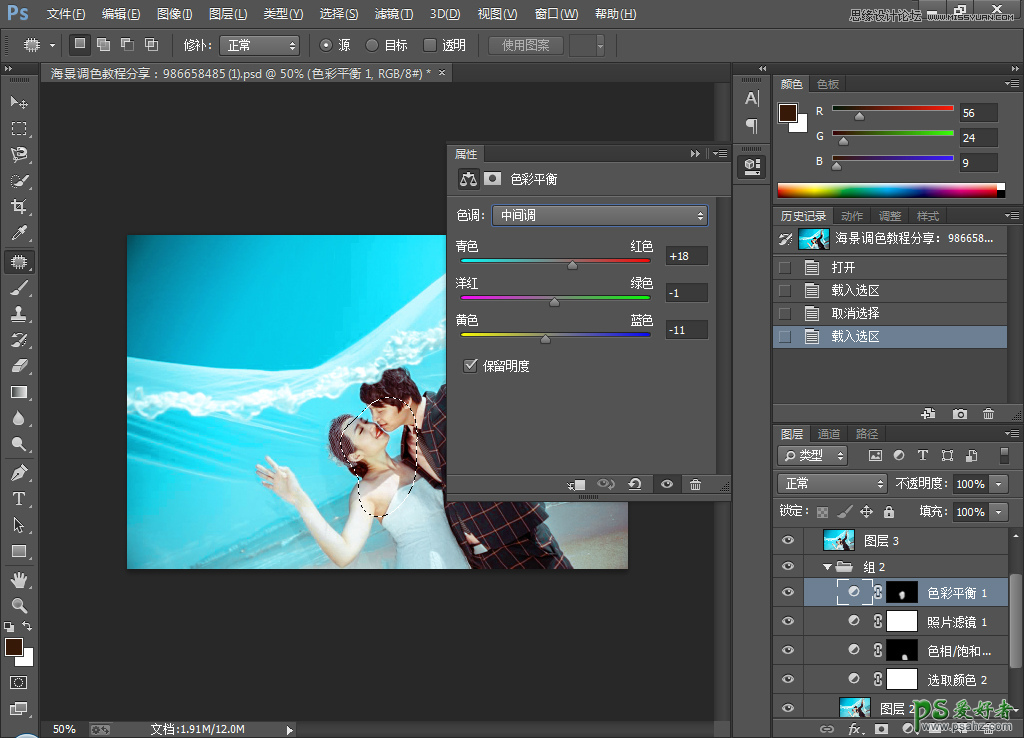 PS婚片后期调色教程:给外景浪漫的海景婚纱照调出时尚蓝色风格