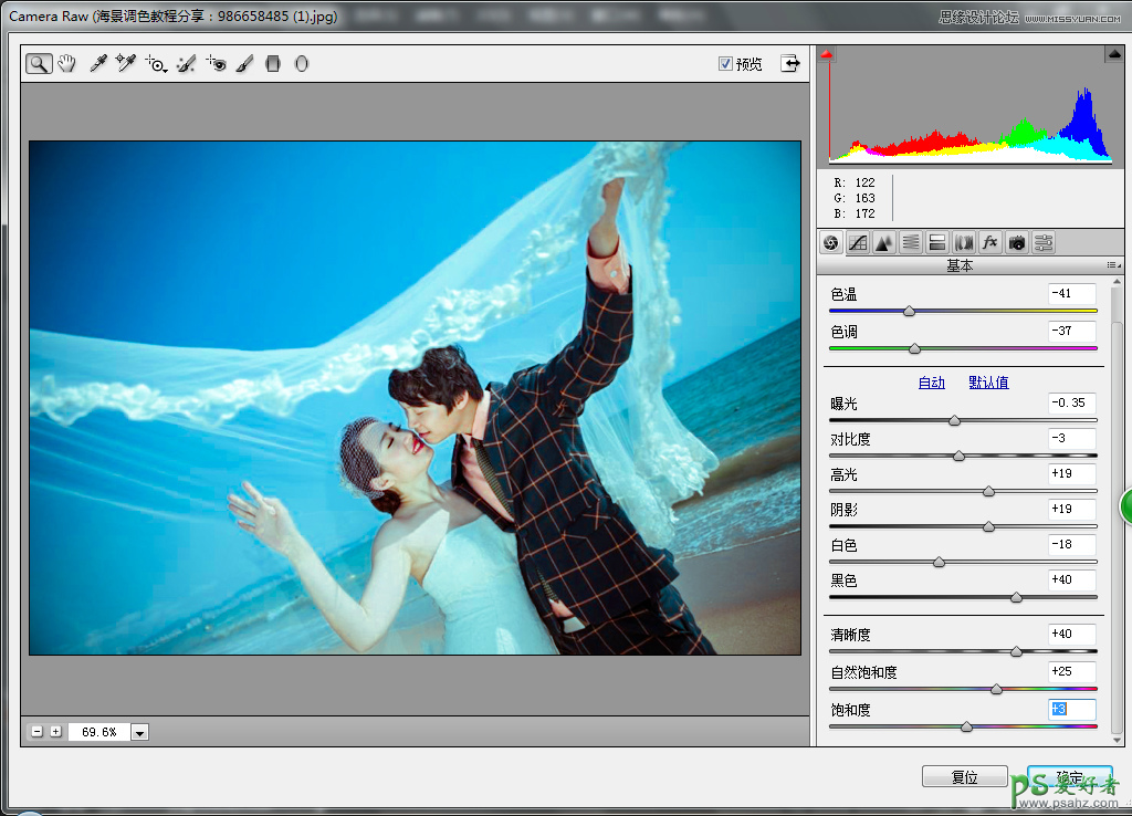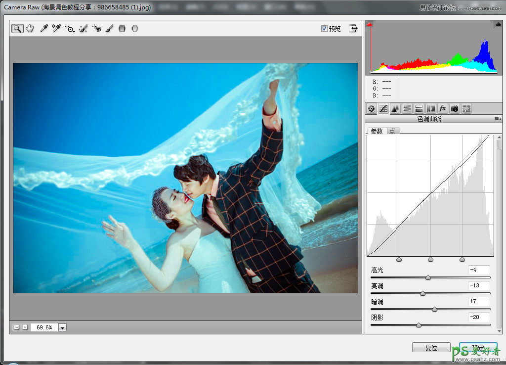 PS婚片后期调色教程:给外景浪漫的海景婚纱照调出时尚蓝色风格