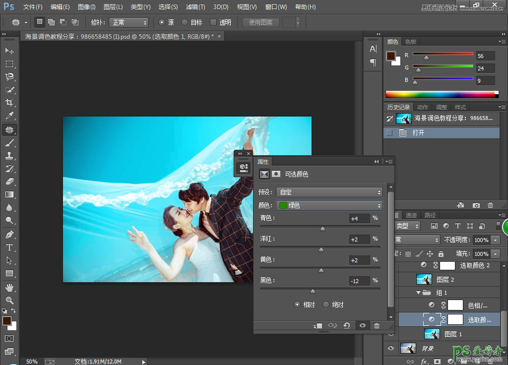 PS婚片后期调色教程:给外景浪漫的海景婚纱照调出时尚蓝色风格