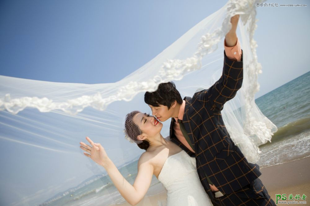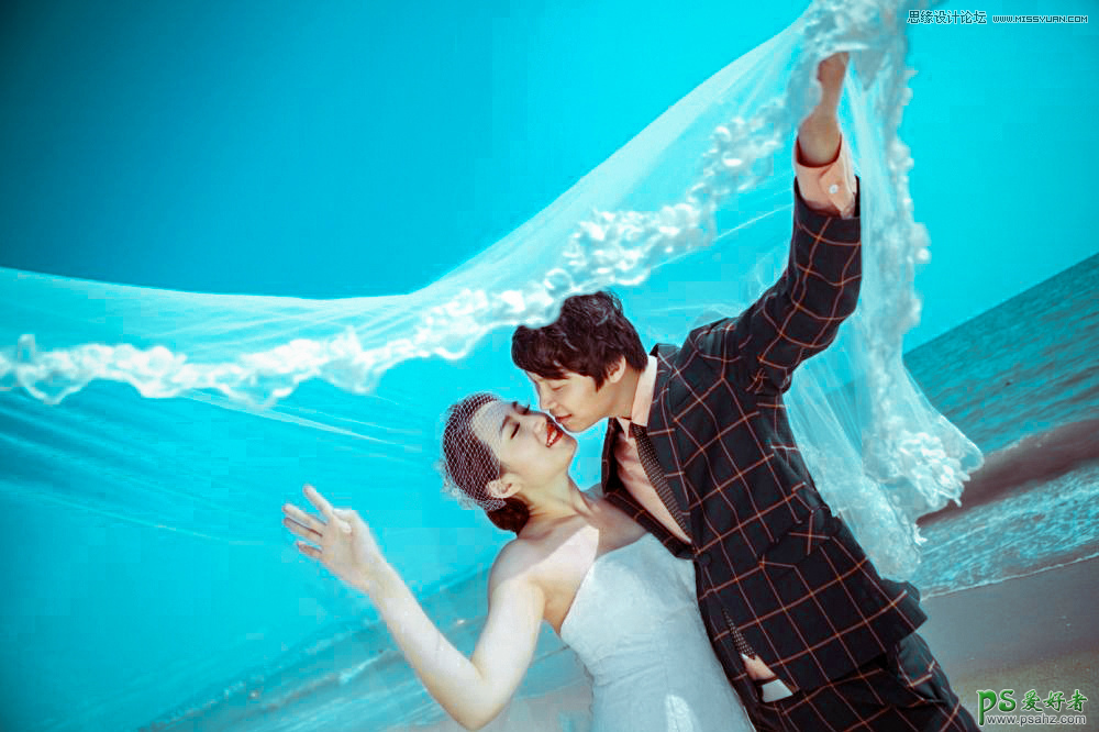 拍婚纱照的情侣们都喜欢到海边,因为海景照片既浪漫又唯美,今天我们就分享给大家一篇PS婚片后期调色教程:给外景浪漫的海景婚纱照调出时尚蓝色风格,这个也是我们在影楼工作的设计师们经常调的色彩,喜欢的朋友们动手试一下吧!效果图: