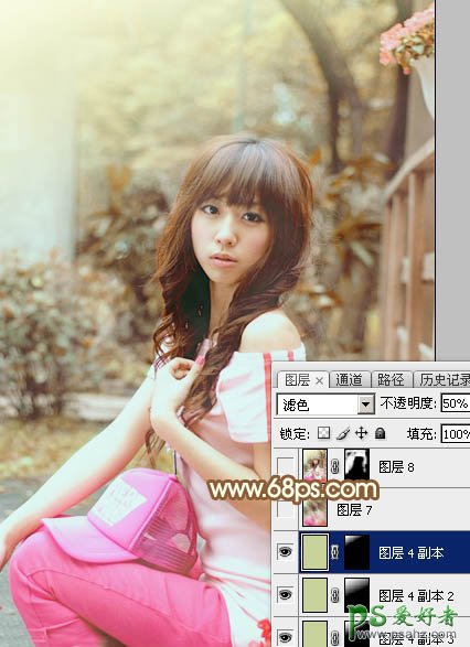16、按Ctrl + J 把当前图层复制一层,混合模式改为“滤色”,不透明度改为:50%,这一步给图片左上角部分增加阳光效果。