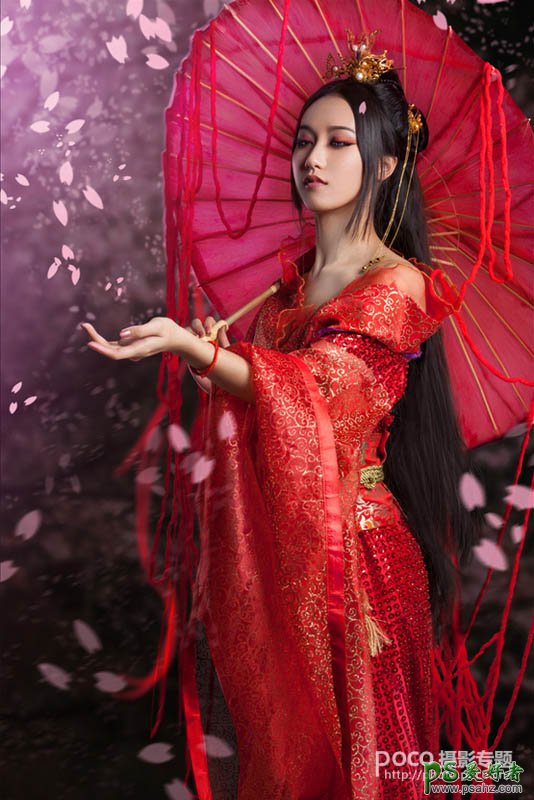 4、这里我加了一个紫色的光源在左上角,因为那本来是一个轮廓光,因为拍摄的时候用的栅格柔光箱,也没有色片。在这个氛围中我需要用紫色代表神秘。可以看到脸上的轮廓,和伞的边缘,手指细微的地方我都有染了一层紫色。衣服下面我也加了一个风动的绸带效果,因为原来静帧的图片,有点呆,花瓣加绸带飘荡就灵动了。