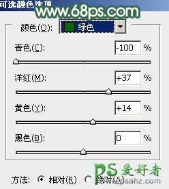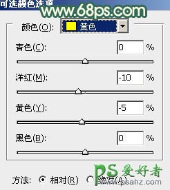 2、创建可选颜色调整图层,同样会黄,绿色进行调整,参数及效果如下图。这一步给图片增加黄色。