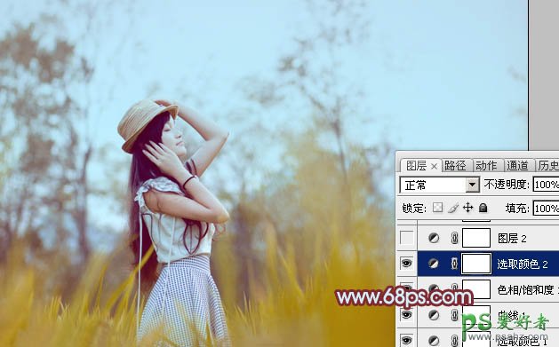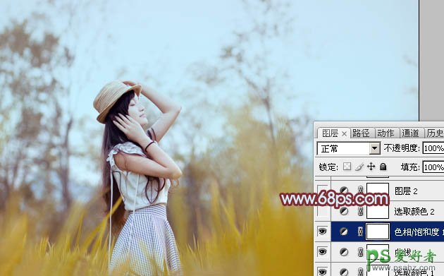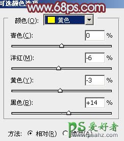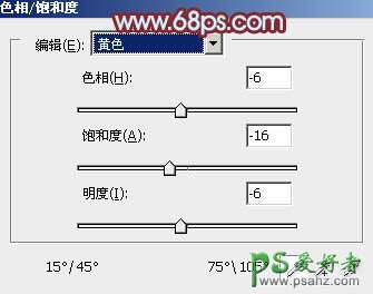 4、创建色相/饱和度调整图层,对黄色进行调整,适当降低饱和度及明度,参数及效果如下图。