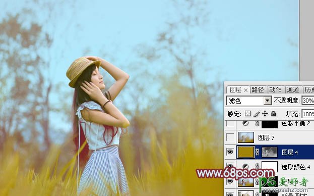 10、按Ctrl + Alt + 2 调出高光选区,按Ctrl + Shift + I 反选,新建一个图层填充黄褐色:#A28408,混合模式改为“滤色”,不透明度改为:30%,效果如下图。这一步增加图片暗部亮度。