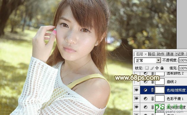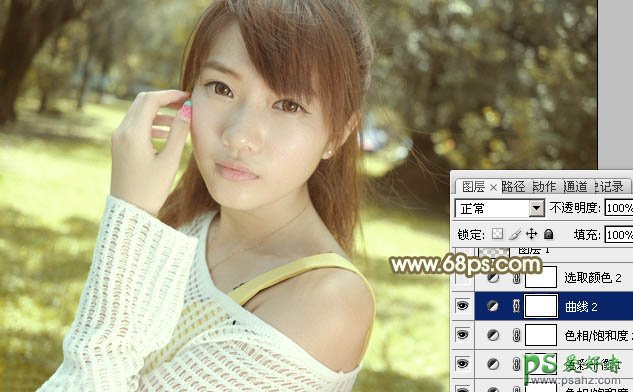 6、创建曲线调整图层,对绿,蓝通道进行调整,参数设置如图19,20,效果如图21。这一步给图片增加黄绿色。