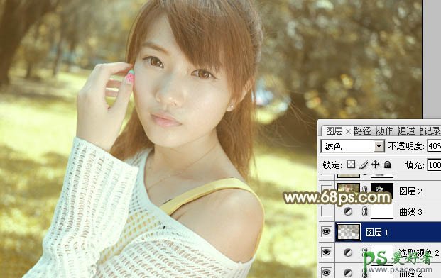 8、按Ctrl + Alt + 2 调出高光选区,按Ctrl + Shift + I 反选得到暗部选区,新建一个图层填充黄褐色:#6A612A,混合模式改为“滤色”,不透明度改为:40%。这一步给图片暗部增加较淡的黄褐色。