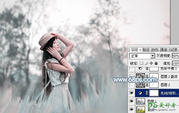 2、创建色相/饱和度调整图层,对青色进行调整,参数设置如图2,确定后把图层不透明度改为:50%,效果如图3。这一步微调图片中的青色。