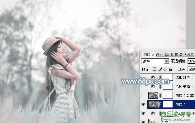 3、新建一个图层,按字母键“D”,把前背景颜色恢复到默认的黑白。然后执行:滤镜 > 渲染 > 云彩,确定后把图层混合模式改为“滤色”,不透明度改为:50%,效果如下图。这一步给图片增加梦幻效果。