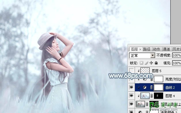 11、创建曲线调整图层,对RGB,蓝通道进行调整,参数设置如图24,确定后按Ctrl + Alt + G 创建剪贴蒙版,效果如图25。这一步把人物肤色部分调亮。