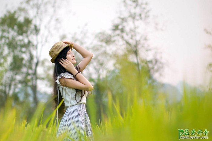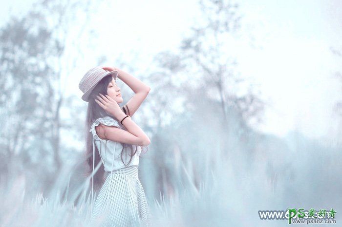 ps教程-ps青色图片调色:给野外自拍美女图片调出梦幻淡青色