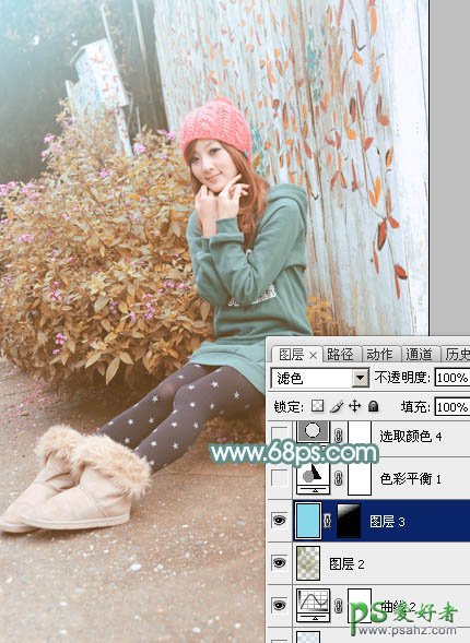 7、按Ctrl + Alt + 2 调出高光选区,按Ctrl + Shift + I 反选,新建一个图层填充黄绿色:#838533,混合模式改为“滤色”,不透明度改为:30%,效果如下图。这一步给图片暗部增加褐色。