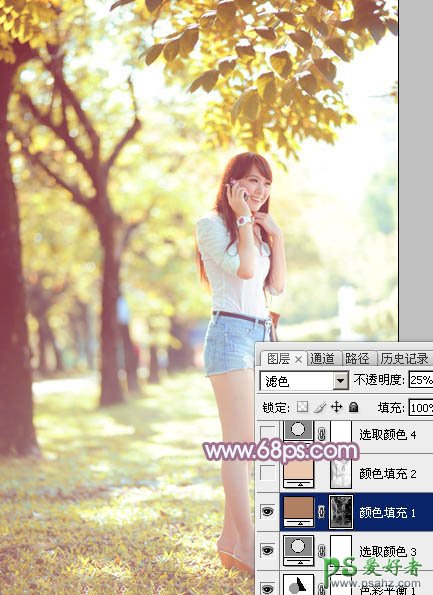 6、按Ctrl + Alt + 2 调出高光选区,按Ctrl + Shift + I 反选得到暗部选区,然后创建纯色调整图层,颜色设置为:#AF8064,确定好把图层混合模式改为“滤色”,不透明度改为:25%,效果如下图。这一步给暗部增加黄褐色。