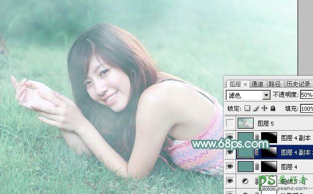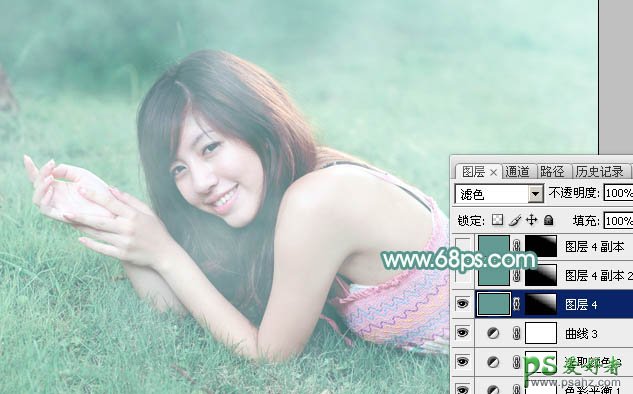 13、新建一个图层填充青绿色:#629B91,混合模式改为“滤色”,添加图层蒙版,用黑白渐变由右上角至左下角拉出白到黑的线性渐变。