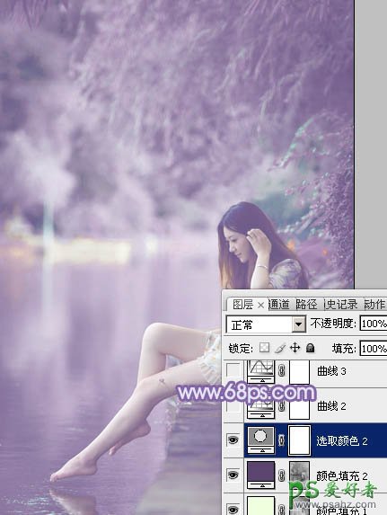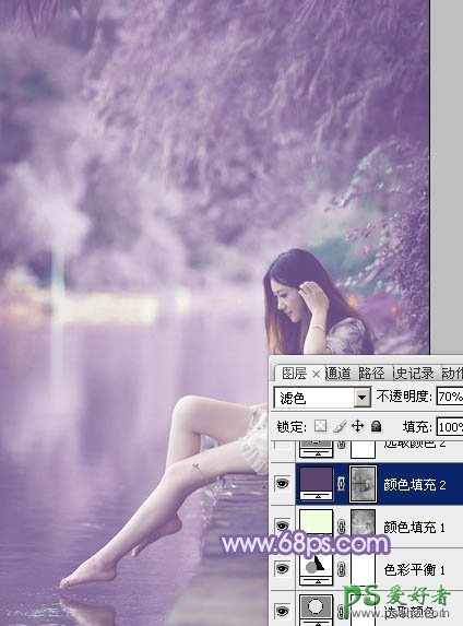 6、按Ctrl + Alt + 2 调出高光选区,按Ctrl + Shift + I 反选,创建纯色调整图层,颜色设置为暗紫色:#5B446D,确定后把混合模式改为“滤色”,不透明度改为:70%,效果如下图。这一步给暗部增加较淡的紫色。