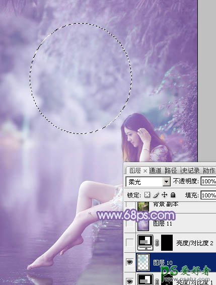 15、新建一个图层,用椭圆选框工具拉出下图所示的椭圆选区,羽化70个像素后填充淡青色:#98C8CA,混合模式改为“柔光”,效果如下图。这一步给高光部分增加一点补色。