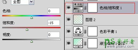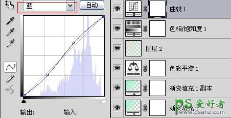 8、新建色彩饱和度调整层,设置饱和度为-15,新建曲线图层。参数为:蓝色通道添加节点1为65、75,节点2为170、160。