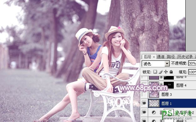 8、按Ctrl + Alt + 2 调出高光选区,按Ctrl + Shift + I 反选,新建一个图层填充暗紫色:#7A5E7F,混合模式改为“滤色”,不透明度改为:30%,效果如下图。这一步增加暗部亮度。