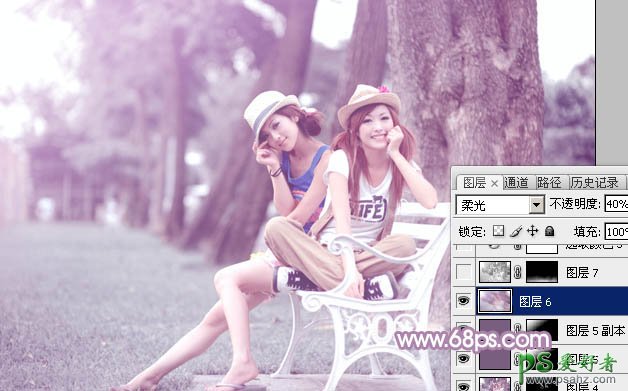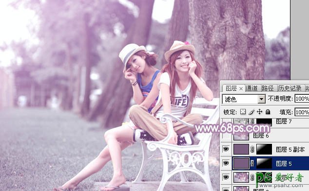 10、新建一个图层,填充暗紫色:#7A5E7F,混合模式改为“滤色”,安装Alt键添加图层蒙版,用白色画笔把左上角部分擦出来,给图片增加高光,效果如下图。