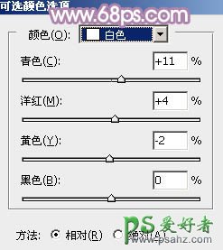 12、创建可选颜色调整图层,对洋红,白色进行调整,参数及效果如下图。这一步微调主色及高光部分的颜色。