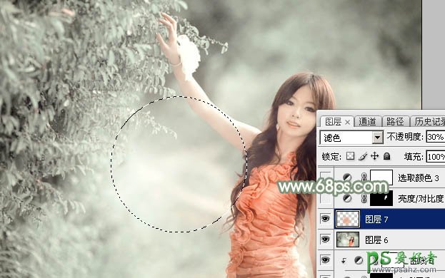 14、新建一个图层,用椭圆选框工具拉出下图所示的椭圆选区,羽化80个像素后填充橙红色:#E4AC8A,混合模式改为“滤色”,不透明度改为:30%,效果如下图。