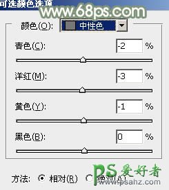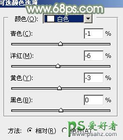 15、创建可选颜色调整图层,对白、中性、黑进行调整,参数及效果如下图。这一步把主色稍微调柔和。