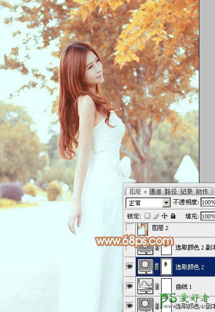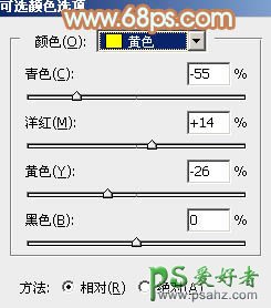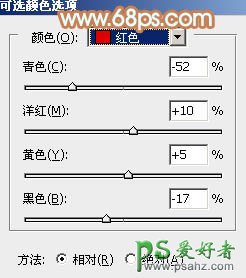 5、创建可选颜色调整图层,对红、黄、白进行调整,参数设置如图11 - 13,确定后用黑色画笔在蒙版上把人物头部及头发部分擦出来,效果如图14。这一步主要把图片中的橙黄色转为橙红色。