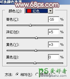15、创建可选颜色调整图层,对红,黄进行调整,参数及效果如下图。这一步微调人物肤色。