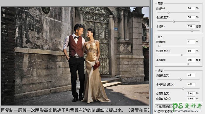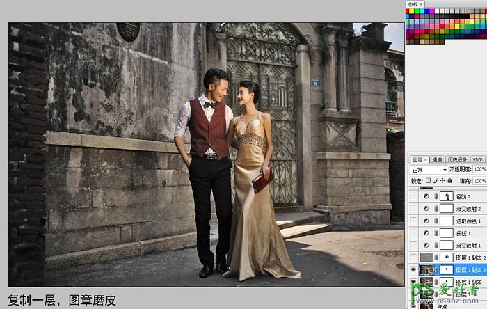 PS婚片后期调色教程:给婚纱照调出复古质感的古建筑婚片色彩