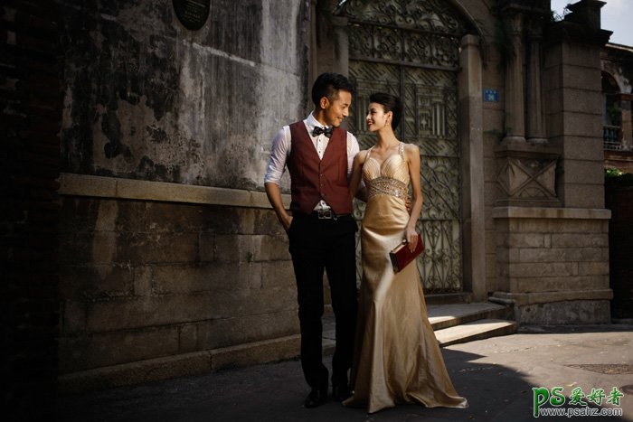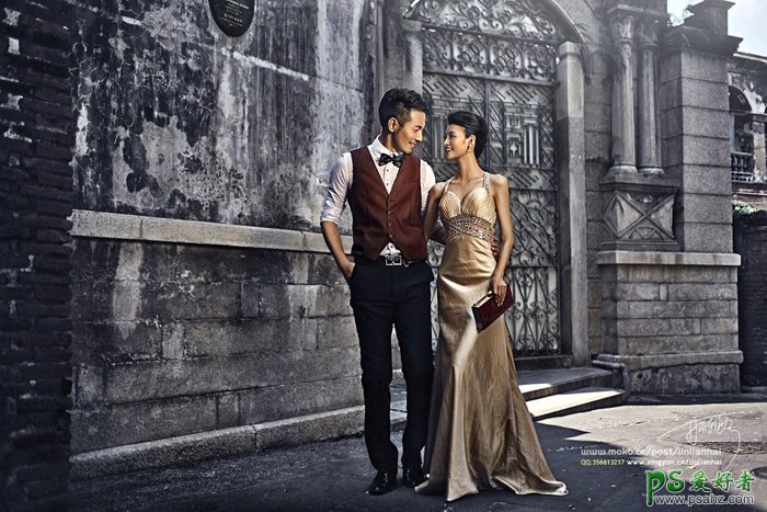 这里我们学习一例PS婚片后期调色教程:给婚纱照调出复古质感的古建筑婚片色彩,复古色彩影楼婚纱照后期调色,我们首先要分析下原片,存在哪些不足的地方。这张片子拍得不错,但是暗部细节损失较多;调子上来说,略微显浊,不够清爽。所以想在色彩上做一个冷暖的对比,质感的加强也是必须的。 原图