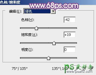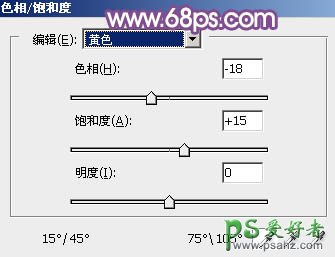 1、打开素材图片,创建色相/饱和度调整图层,对黄,绿色进行调整,参数及效果如下图。这一步快速把背景部分的主色转为橙黄色。