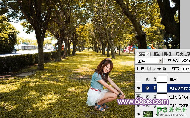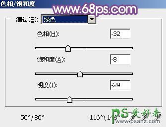 3、再创建色相/饱和度调整图层,对绿色进行调整,参数及效果如下图。这一步减少图片中的绿色。