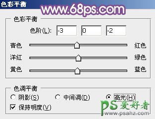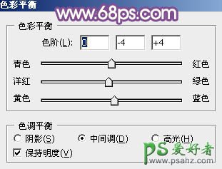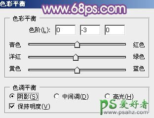 10、创建色彩平衡调整图层,对阴影、中间调、高光进行调整,参数设置如图26 - 28,效果如图29。这一步给图片增加蓝色。