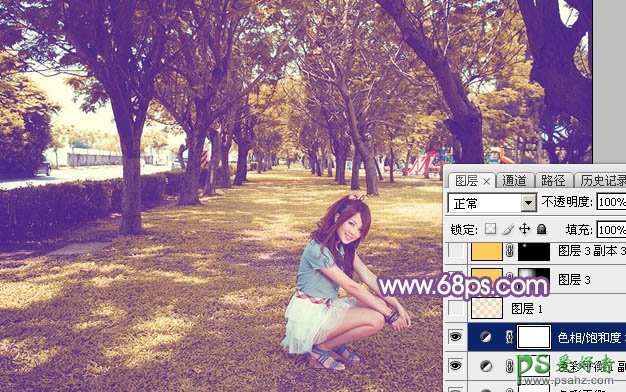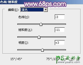 12、创建色相/饱和度调整图层,对黄色进行微调,参数及效果如下图。这一步减少橙黄色亮度。